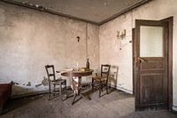 Kamer in een verlaten en vervallen huis, de tafel met twee stoelen staan gezellig in een hoek, de wijnfles nog op tafel, de krant ernaast. Hier woont al jaren niemand meer, maar toch lijkt het of er zo iemand aan tafel kan gaan zitten met zijn krant en een goed glas wijn. Er hangt een verlaten sfeer, en toch ook weer niet. De verf…