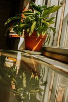 Kamerplant & reflectie – terracotta pot bij zonnig raam | warme minimalistische interieurkunst van Broodrooster Studio – Creatieve Fotografie