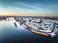 Stadsgezicht Kampen aan de IJssel tijdens een koude winterse zonsopgang aan het begin van een koude heldere winterdag met lichte sneeuw op de daken. Uitzicht op de Nieuwe Toren en de winkelstraat Oudestraat. Kampen is een oude Hanzestad aan de oever van de rivier de IJssel in Overijssel, Nederland.
