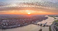 Kampen panoramische luchtfoto op de Hanzestad Kampen aan de IJssel tijdens een voorjaarszonsondergang in Overijssel. De stroom van de rivier leidt naar de ondergaande zon in de verte, terwijl in de stad lichtjes opdoemen aan het einde van een mooie lentedag.