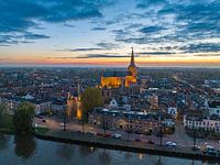 Kampen aan de oever van de IJssel tijdens zonsondergang van bovenaf gezien met de Koornmarktspoort en Bovenkerk in de oude binnenstad van Kampen tijdens een herfstzonsondergang. De Koornmarktspoort is de oudste poort van Kampen aan de oever van de IJssel. De Bovenkerk of de Sint Nicolaaskerk is een grote, gotische kerk en het meest opvallende element aan de skyline van Kampen aan de rivier de IJssel in de provincie Overijssel.