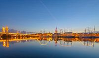 Avondgezicht op de skyline van de stad Kampen in Overijssel, Nederland. De lichten van de stad worden weerspiegeld in het kalme water terwijl de lucht net na zonsondergang blauw is geworden.