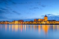 Avondpanorama van de skyline van de stad Kampen in Overijssel, Nederland. De lichten van de stad worden weerspiegeld in het kalme water terwijl wolken zich in de lucht over de stad bewegen.