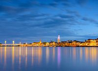 Avondpanorama van de skyline van de stad Kampen in Overijssel, Nederland. De lichten van de stad worden weerspiegeld in het kalme water terwijl wolken zich in de lucht over de stad bewegen.