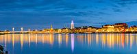 Avondpanorama van de skyline van de stad Kampen in Overijssel, Nederland. De lichten van de stad worden weerspiegeld in het kalme water terwijl wolken zich in de lucht over de stad bewegen.