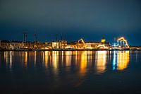 Avondpanorama van de skyline met de Stadbrug en Nieuwe Toren van de stad Kampen in Overijssel, Nederland. De lichten van de stad worden weerspiegeld in het kalme water terwijl wolken in de lucht over de stad bewegen.