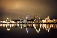 Avond aan de skyline van de stad Kampen in Overijssel, Nederland. De lichten van de stad worden weerspiegeld in het kalme water terwijl de lucht net na zonsondergang blauw is geworden.