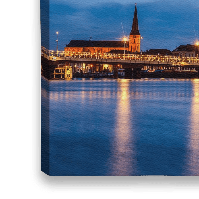 Zicht over de IJssel op de Overijsselse stad Kampen tijdens het blauwe uurtje net na zonsondergang.