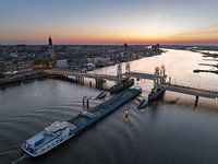 Bovenaanzicht van de stad Kampen tijdens een voorjaarsavond met een vrachtschip dat de stadsbrug passeert en zonlicht dat de rivier de IJssel raakt langs de oude Hanzestad in Overijssel, Nederland.