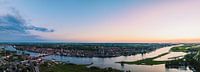 Panoramische luchtfoto van de Hanzestad Kampen aan de rivier de IJssel tijdens een voorjaarszonsondergang in Overijssel. De stroming van de rivier leidt naar de ondergaande zon in de verte terwijl de lichtjes in de stad tevoorschijn komen aan het einde van een mooie lentedag.
