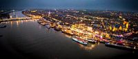 Avondpanorama van de skyline met de Stadbrug en Nieuwe Toren van de stad Kampen in Overijssel, Nederland. De lichten van de stad worden weerspiegeld in het kalme water terwijl wolken in de lucht over de stad bewegen.