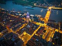 Avondpanorama van de skyline met de Stadbrug en Nieuwe Toren van de stad Kampen in Overijssel, Nederland. De lichten van de stad worden weerspiegeld in het kalme water terwijl wolken in de lucht over de stad bewegen.