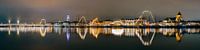 Avond aan de skyline van de stad Kampen in Overijssel, Nederland. De lichten van de stad worden weerspiegeld in het kalme water terwijl de lucht net na zonsondergang blauw is geworden.