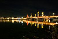 Stadsbrug en Nieuwe Toren verlicht in oranje kleur voor Internationale Dag voor de Uitbanning van Geweld tegen Vrouwen in Kampen, Overijssel, Nederland op 25 november. De Verenigde Naties willen mensen bewust maken van de positie van vrouwen over de hele wereld die het slachtoffer zijn van huiselijk geweld, verkrachting en andere vormen van geweld.