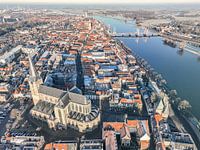 Koude vroege winterochtend in Kampen van bovenaf gezien met de Bovenkerk in het midden en de stromende IJssel op de achtergrond in Overijssel, Nederland.