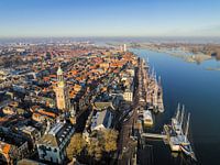 Stadsgezicht Kampen aan de IJssel tijdens een koude heldere winterzonsopgang met lichte sneeuw op de daken. Uitzicht op de Nieuwe Toren en de winkelstraat Oudestraat. Kampen is een oude Hanzestad aan de oever van de IJssel in Overijssel, Nederland.