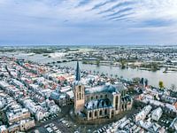 Koude vroege lenteochtend in Kampen van bovenaf gezien met de Bovenkerk in het midden en de stromende IJssel op de achtergrond in Overijssel, Nederland.