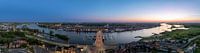 Bovenaanzicht van de stad Kampen tijdens een lenteavond met zonlicht dat de rivier de IJssel raakt langs de oude Hanzestad in Overijssel, Nederland.