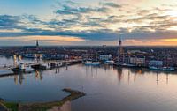 Zicht op de Hanzestad Kampen aan de rivier de IJssel tijdens zonsondergang in de winter. Foto vanaf een hoog standpunt.