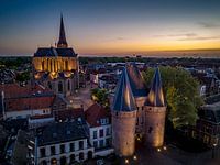 Koornmarktspoort en Bovenkerk in de oude binnenstad van Kampen tijdens een voorjaarszonsondergang van bovenaf gezien. De koornmarktspoort is de oudste poort van Kampen gelegen aan de oever van de IJssel.