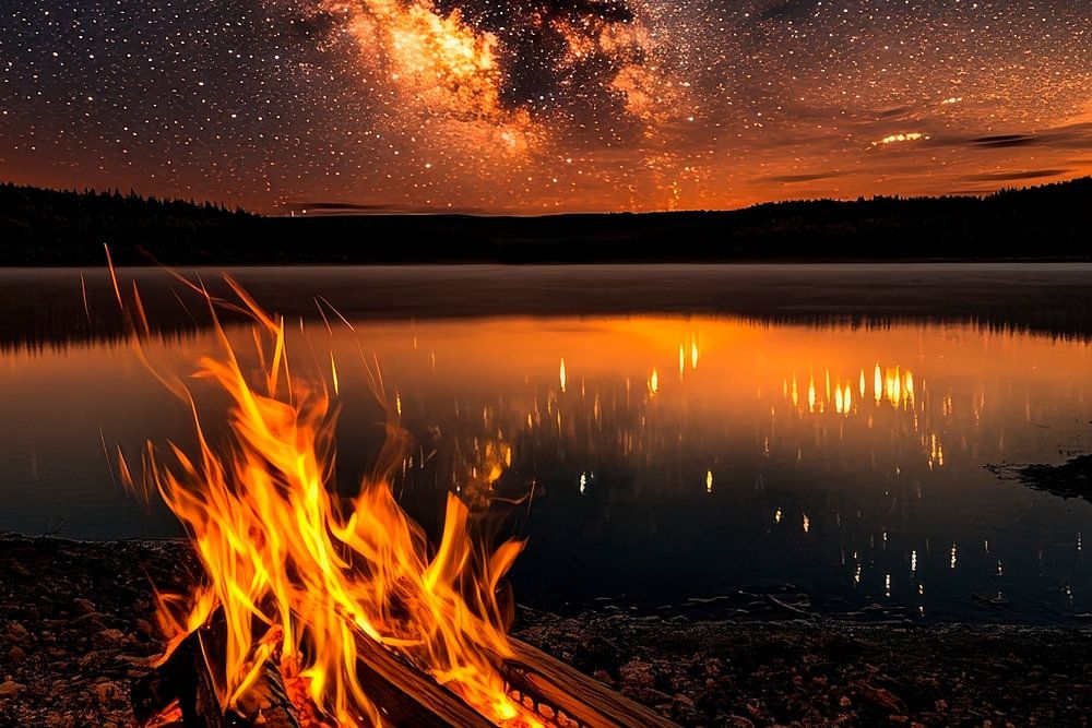 Een laaiend vuur danst in het zachte licht van de nacht, terwijl fonkelende sterren worden weerspiegeld boven het stille water. Dit magische tafereel straalt rust en geborgenheid uit, perfect voor in de woonkamer, waar het verhalen vertelt en een vleugje avontuur in het dagelijks leven brengt. Elke blik doet de ziel dromen.