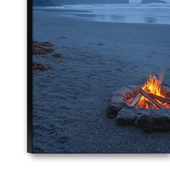 Deze sfeervolle afbeelding toont een eenzaam kampvuur dat rustig brandt op een verlaten strand tijdens de schemering. De zachte gloed van het vuur contrasteert prachtig met de koele, blauwe tinten van de lucht en de zee, waardoor een serene, bijna mystieke sfeer ontstaat. De silhouetten van de rotsen en het bos op de achtergrond geven de scène een extra vleugje rust en eenzaamheid, ideaal voor diegenen die houden van de schoonheid en eenvoud van de natuur. Dit ontwerp straalt kalmte uit en zou perfect passen in een moderne woonruimte of kantooromgeving als een visueel rustpunt.