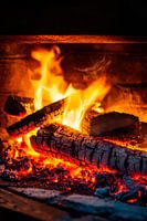 Dansende vlammen stijgen op in betoverende spiralen en werpen een warm, lambberend licht op de zwartgeblakerde houtblokken. Gloeiende kolen gloeien in levendig oranje en rood, terwijl een zachte rook opstijgt en de lucht vult met een vleugje gezelligheid. De magie van het vuur ontvouwt zich op een uitnodigende en mysterieuze manier.
