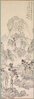 Een eenzame, oudere figuur, zijn terugtrekking uit de wereld verscholen in de bergen bij een waterval, kijkt uit zijn raam op het landschap beneden. Een gedicht in het Chinees rechtsboven geeft de sfeer van het schilderij weer: de nadering van de avond, het licht dat door de wolken komt en een koel bergbriesje na een regenbui.