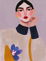 Een stijlvolle, mysterieuze dame met een blik die ergens tussen "ik ben geïntrigeerd" en "je hebt nog precies 3 seconden om iets zinnigs te zeggen" balanceert. Haar rode lippen en strakke wenkbrauwen verraden zelfvertrouwen, terwijl haar pose suggereert dat ze diep nadenkt—of gewoon wacht tot iemand haar cappuccino brengt. De subtiele penseelstreken en warme kleurcombinatie geven het werk een moderne, dromerige uitstraling.