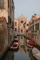 Kanaal met huizen, een kerk en boten in centrum van oude stad Venetie, Italie