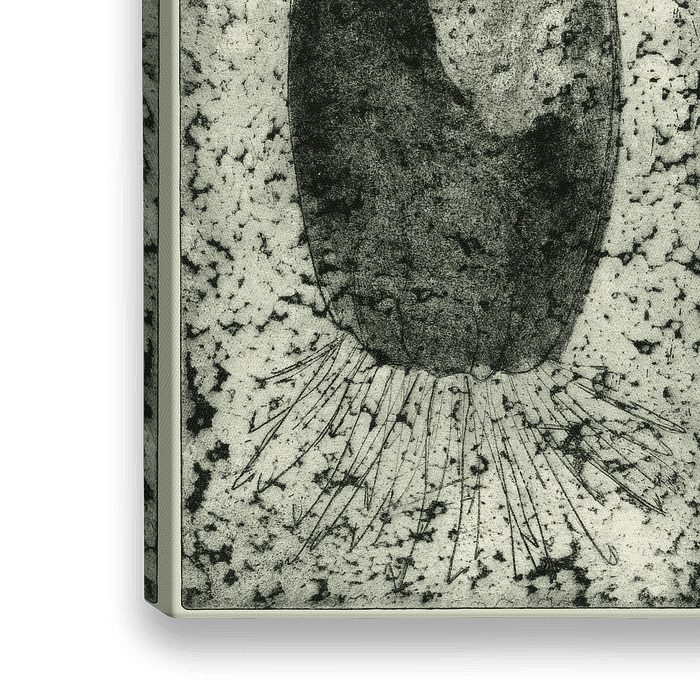 De ets toont de uitvergrote weergave van een plantenzaadje.