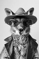 Portret van een kangoeroe met hoed en zonnebril tegen een neutrale achtergrond, gekleed in een trendy outfit met luipaardprint.