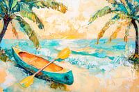 Levendige kleuren en de zachte omhelzing van palmbomen en water roepen vakantiegevoelens op. Een kajak, klaar voor avontuur, harmonieert perfect met de gouden zonsondergang die het landschap verlicht. Deze ontspannende illustratie brengt een maritieme frisheid in elke woonkamer of creëert een vrolijke sfeer in een zomerse kamer.