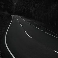 Een weg in een bos in de Kansai-regio, Japan. Zwart-witfoto.