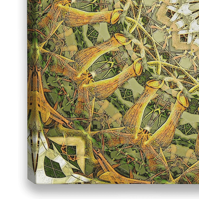 Een caleidoscopisch beeld, gecreëerd door het kopieren, roteren en mengen van een foto van een nepenthes, een vleesetende tropische bekerplant (kantong semar in het Indonesisch)