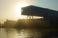 Kantoor van Unilever op de Kop van Zuid in Rotterdam met tegenlicht op een mistige dag.