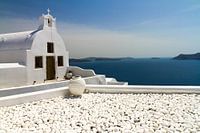 Fantastisch gelegen traditioneel wit geschilderde kapelletje met geweldig uitzicht op het blauwe water van de caldera van Santorini, Griekenland. Witte kiezels en een aardewerken pot in de voorgrond. Oia.