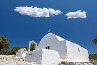 Een kleine, witte kapel ligt bij het kasteel van Monolithos in het noorden van het eiland Rhodos.
