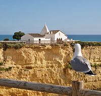 Een populaire toeristische attractie in de Algarve bij Lagoa. De kleine kapel van Senhora da Rocha op een rots in de Atlantische Oceaan. Hier met een typische zeemeeuw