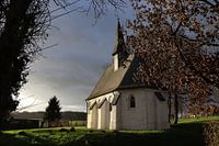 De historische kapel van het Heilig Kruis (Woestijnkapel) in Gooik, België. Gelegen in het Vlaamse Pajottenland nabij Ninove, op een vroegere pelgrimsroute naar Compostela, werd ze gebouwd rond 1600. Prachtig avondlicht verlicht de kapel op een stormachtige winterdag. Reisfotografie, Vlaanderen.