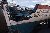 Een kapotte roeiboot bij een scheepswerf in Madalena op Pico, Azoren. Na een botsing op de wilde Atlantische Oceaan ligt de sloep nu klaar om gemaakt te worden.