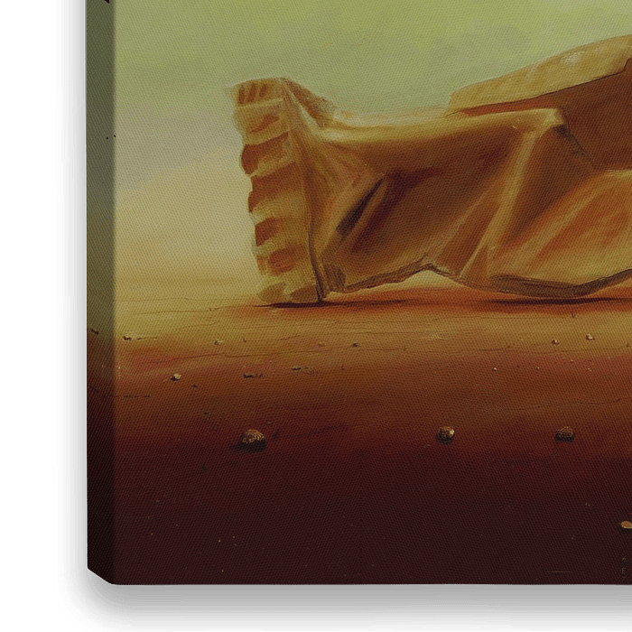 Dit schilderij toont een fascinerend woestijnlandschap, gekenmerkt door karakteristieke kenmerken zoals kamelen en een zanderige, stenige ondergrond. Maar het echte unieke van dit kunstwerk ligt in de onconventionele weergave van de kamelen. In plaats van levende dieren verschijnen ze, netjes op een rij, uit een snoepzak of snoepwikkel.…