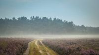 Op een avond, vlak voor zonsondergang, trekt er een colone schapen onder dekking van grondmist over de hei. Op de achtergrond is de bosrand zichtbaar.