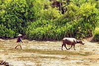 Een boer op Lombok die zijn Karbau van het ene weidegebied naar het andere brengt.
