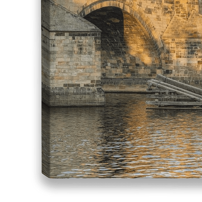 Uitzicht vanaf de oever van de Moldau langs de Karelsbrug in de richting van de Oude Stad. De avondzon baadt het tafereel in een mooi, warm licht.