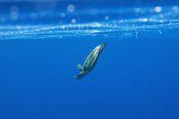 Karetschildpad in het diepe blauw van de Indische Oceaan, duikend onder het wateroppervlak