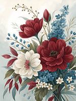 Dit kunstwerk legt een weelderig en levendig boeket vast, gedomineerd door diep karmozijnrode en roomwitte bloesems. De rijke roodtinten van de pioenachtige bloemen trekken de aandacht, hun fluweelachtige bloemblaadjes ontvouwen zich in sierlijke lagen. De delicate witte bloemen met hun rode hart vormen een mooi contrast en voegen een…
