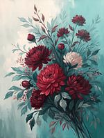 Dit fascinerende schilderij toont een weelderig boeket van diep karmozijnrode en zachtroze bloemen, mogelijk pioenen of dahlia's, tegen een etherische achtergrond van groenblauw en wit. De kunstenaar legt op meesterlijke wijze de fluweelachtige textuur van de bloemblaadjes en de delicate rondingen van de bladeren vast, waardoor een…