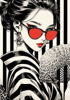 Deze zwart-wit illustratie, een opvallende fusie van moderne elegantie en traditionele schoonheid, wordt geaccentueerd met gedurfd rood, waardoor een mysterieuze en krachtige aanwezigheid ontstaat.