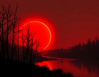 Dit beeld heeft een levendig verzadigde rode zon die de lucht domineert. De intense kleur kan duiden op een zonsopgang of zonsondergang gefilterd door een dichte atmosfeer, of misschien een gestileerde weergave van een unieke hemelse gebeurtenis zoals een bloedmaan. Het licht van de zon's werpt een sterke reflectie op het stille…